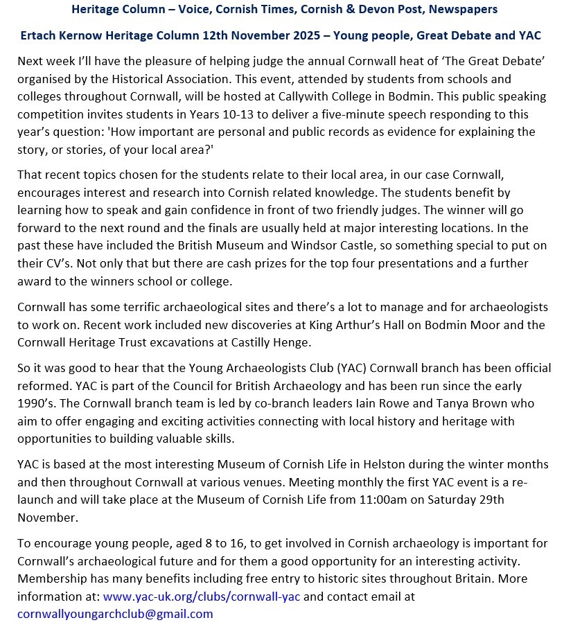 Each week the column next to the main Ertach Kernow article in the Voice, Cornish Times and the Cornish & Devon Post newspapers is devoted to sharing news about Cornish heritage and generally its organisations, societies and groups, similarly new projects in Cornwall's heritage sector. Sometimes just random thoughts about Cornish related 'stuff'. Perhaps readers may wish to share news about their own Cornish organisations.