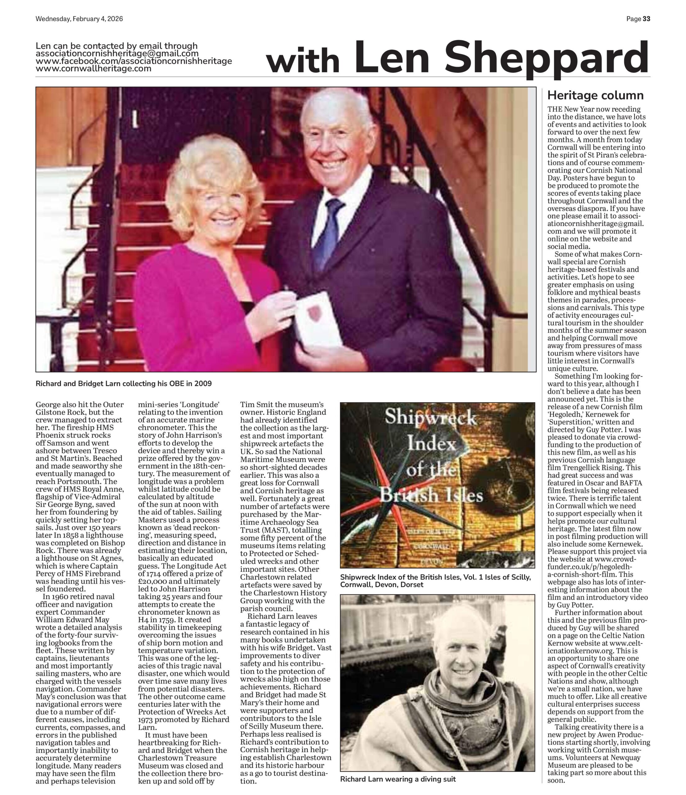 Richard Larn leaves a fantastic legacy of research contained in his many books undertaken with his wife Bridget. Vast improvements to diver safety and his contribution to the protection of wrecks also high on those achievements. Richard and Bridget had made St Mary’s their home and were supporters and contributors to the Isle of Scilly Museum there. Perhaps less realised is Richard’s contribution to Cornish heritage in helping establish Charlestown and its historic harbour as a go to tourist destination.