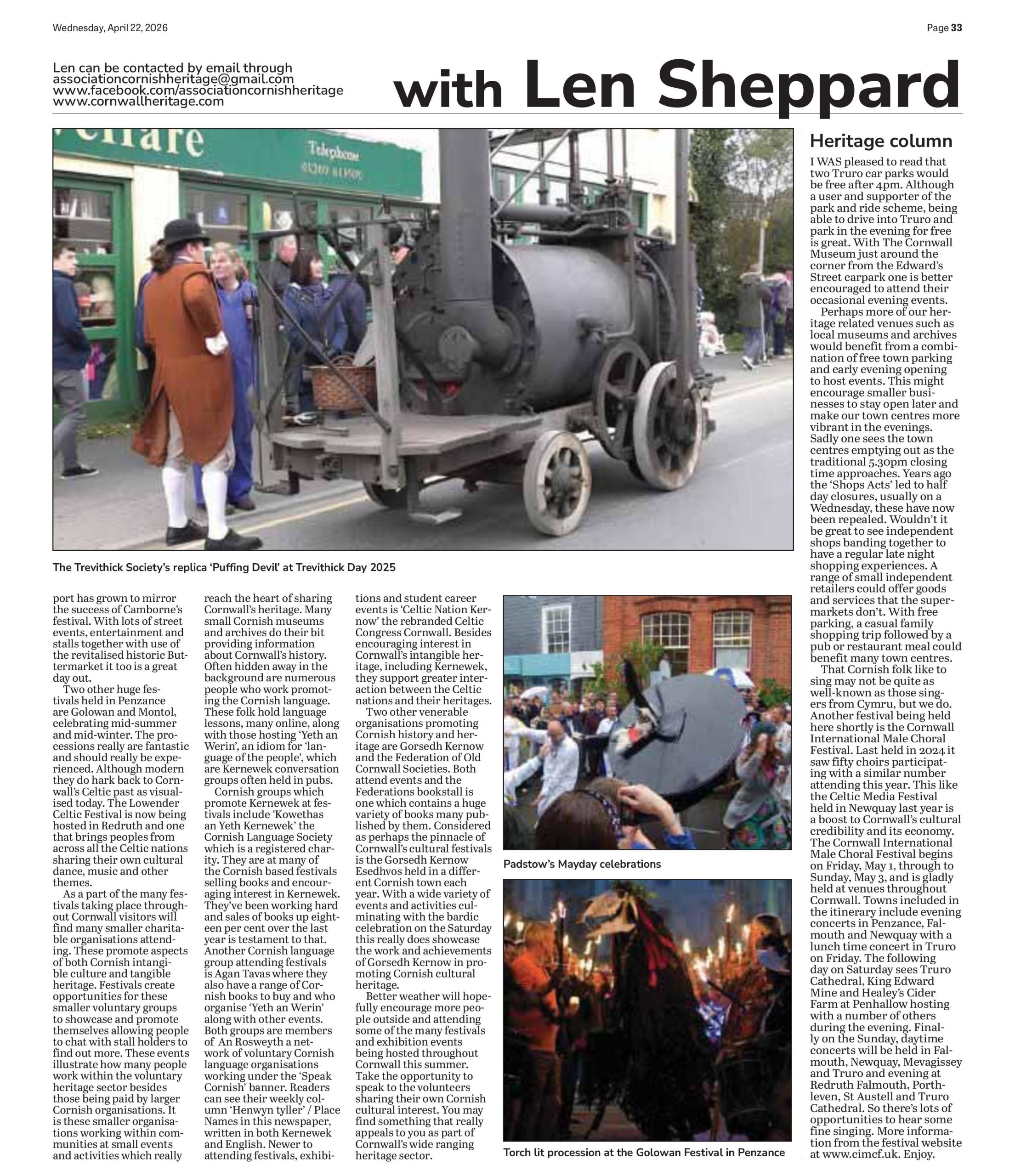 Ertach Kernow Heritage Column 22nd April 2026 – Free parking, late night opening and Cornwall International Male Choral Festival
