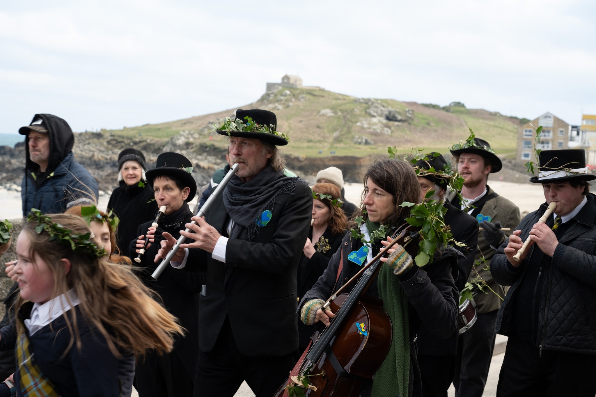 In February the ‘St Ives Feast’ celebrates St Ia, the town’s patron saint, who legend tells us arrived from Ireland floating on a leaf. The traditional ‘Well Procession’ which includes the town mayor, church leaders, musicians and dancing school children travels from the Guildhall to St Ia’s Well at Porthmeor, after which a service of thanksgiving is held. This is followed by something quite different, a hurling contest one of only three now held in Cornwall. Today this is between a large group of children, the winner being the one who holds the silver ball at midday who receives a silver commemorative coin in exchange. Later the mayor throws freshly minted pennies from the balcony of the town hall to the people below. This celebration marks the consecration of St Ives Church in 1434 when this tradition first began. There is also a Guise Dancing event where everyone is encouraged to wear a mask.