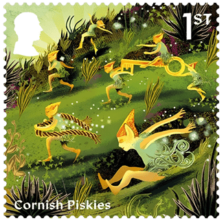 The Cornish piskie although acknowledged as pranksters were not necessarily evil or unkind. Thomas Quiller-Couch in his entry in Notes and Queries in 1855 wrote of them. ‘Our piskies are little beings standing midway between the purely spiritual and the material, suffering a few, at least, of the ills incident to humanity. They have the power of making themselves seen, heard, and felt. They interest themselves in man's affairs; now doing him a good turn, anon taking offence at a trifle, and leading him into all manner of mischief.’ Piskies appear in a number of stories. One charming one ‘the lost child of St. Allen’ relates to a little boy who wandered away from his home in St. Allen into a small valley, in search of flowers. Led away, then hidden and cared for by piskies he was found days later asleep and well. The child grew up living to a ripe old age with never any illness or misfortune and was said to have been truly blessed by the piskies. Recently piskies have appeared on Royal Mail 1st Class stamps.