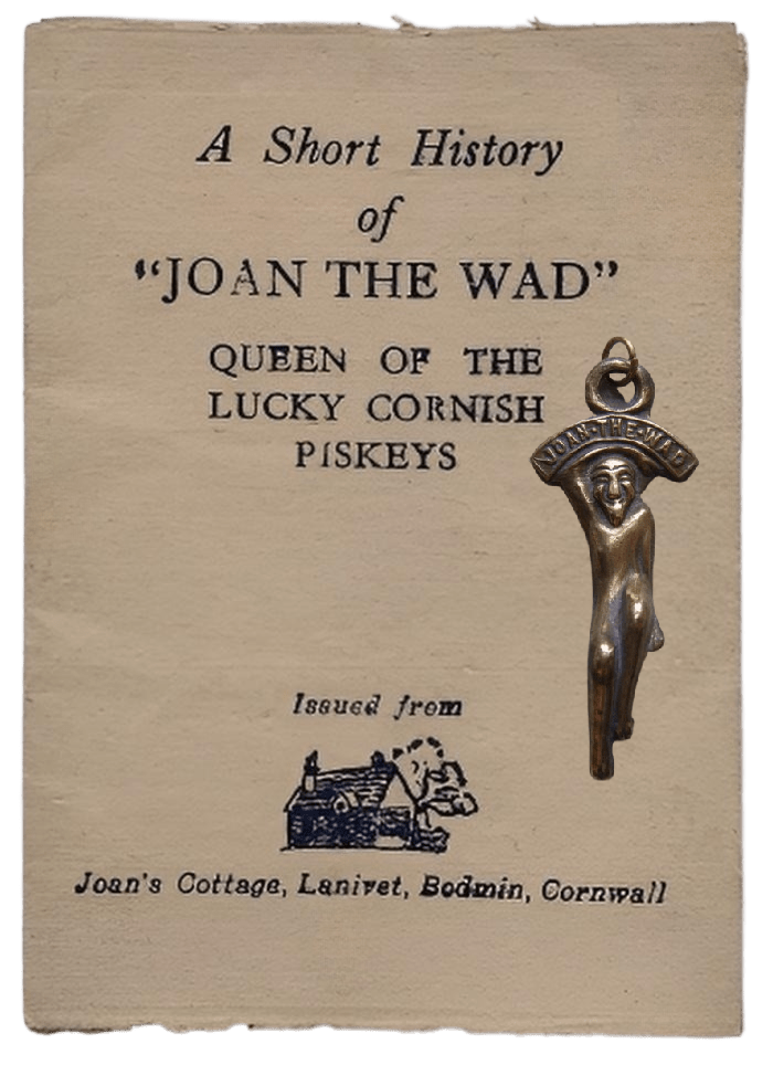 A late comer to the piskie story is of their queen known as ‘Joan the Wad’, Quiller-Couch was the first to mention her. Wad is an old Cornish expression for bundle of straw or torch, how Joan got her name is unknown. However, she became far better known through commercial enterprise and the creation of ‘Joan the Wad’ lucky charms. Started by one F T Nettleinghame this commercial enterprise was hugely successful with many thousands of charms sold worldwide.