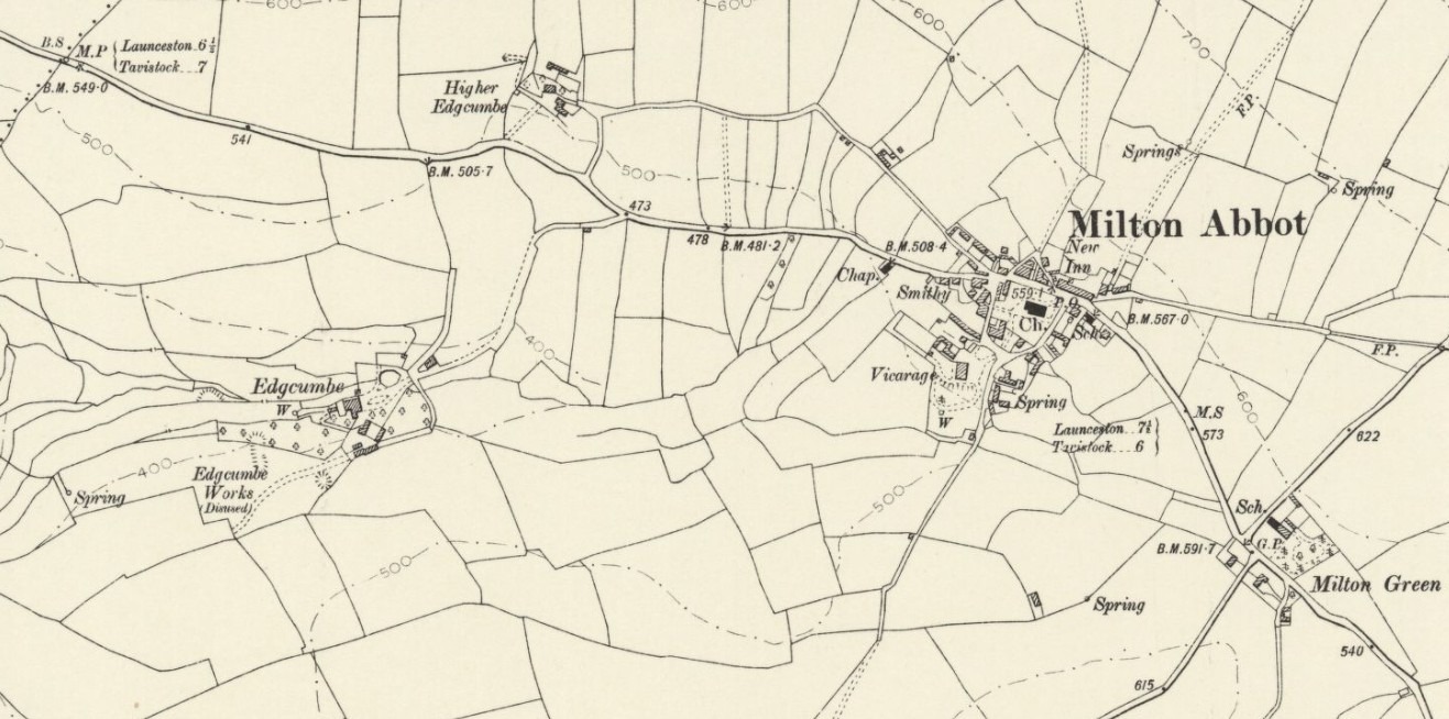 Records held by the Devon Archives and Local Studies Service include deeds of the property dating from around 1280 through to the 19th century for the property named as Edgcumbe House. There were two small hamlets named Higher and Lower Edgcumbe still named on early 20th century maps to the west of Milton Abbot village. Edgcumbe House was from the beginning no more than a farmhouse and has since had many alterations and additions made to it over the following centuries. The property is now a Grade II* listed building with a few remnants within from the 13th century.