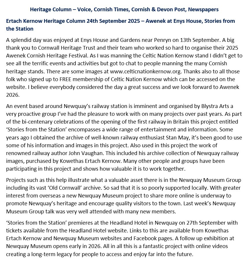 Ertach Kernow Heritage Column 24th September 2025 – Awenek at Enys House, Stories from the Station