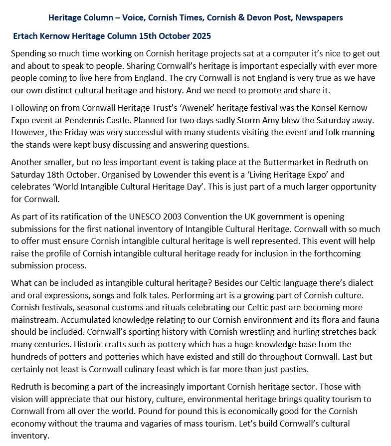 - Intangible heritage key to Cornish distinctiveness - How Cornish intangible heritage makes Kernow a nation.