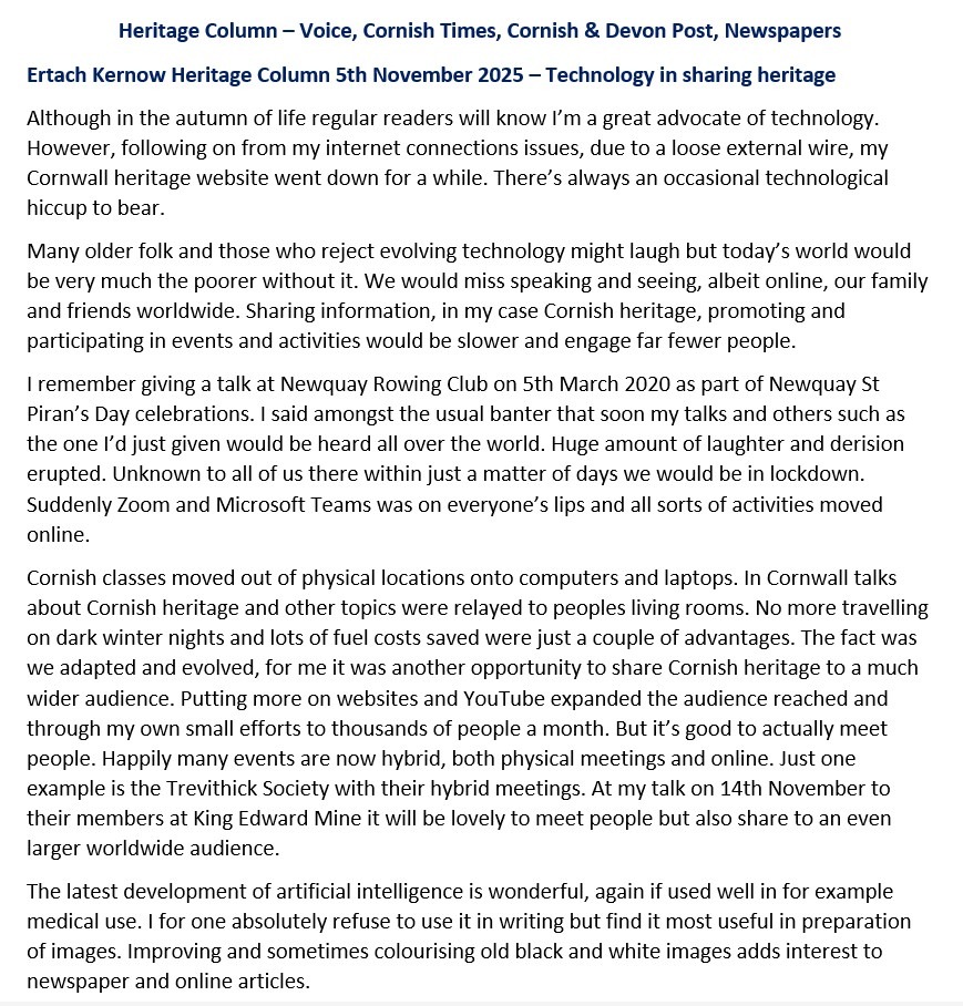 Ertach Kernow Heritage Column 5th November 2025 – Technology in sharing heritage