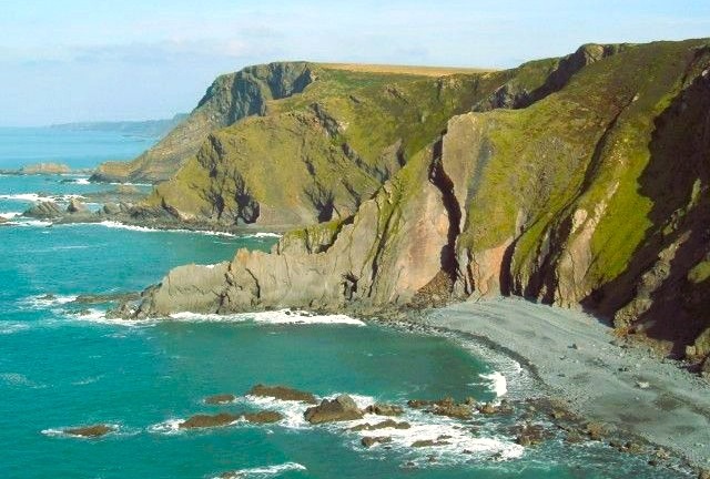 Onwards. Moving inland Lewis asked for directions of Crackington Cove and stopped a while at a farmhouse large enough to be marked on the Ordnance Survey map. From a collection of books he took time to read an account by Reverend Stephen Hawker of a ride from Bude to Boscastle. Lewis was particularly interested in Hawker’s description of Warbstow Bury, written in typical Hawker romantic style. See the Ertach Kernow article number 270 dated 27th August on the website for my recent visit to Warbstow Bury hillfort. Leaving the farmhouse he then writes ‘The approach to Crackington Haven revived my spirits and gave a lilt to my steps. It is a romantic spot, promising all manner of climbs and wanderings over rocks. On the east rises Pencannow Point, a mass of dark slate 400 feet high; to the west is Cambeak (also called Carnbeak) 330 feet high, and between these two headlands lies Crackington Cove. I walked down to the rocks and sat there amid the silence of the unspoilt haven.’