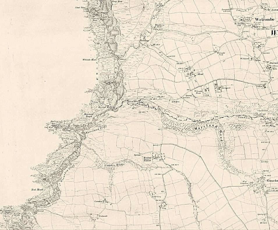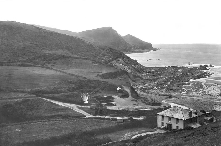 Following instructions to follow the coastguard path from Marsland Mouth to Bude he was persuaded the walk would be easy. He could not find the path, perhaps unused it had become overgrown. Giving up his search he ended up scrambling up low cliffs and through undergrowth whilst carefully avoiding the sea edge cliffs with their dizzying height and boiling surf beneath. Hind makes the point that ‘he who has not walked this section of the north coast cannot imagine the lonely and angry majesty of the sea.’ In his mind whilst overlooking the sea Lewis was thinking about Hawkers talk of Cornish smugglers particularly the notorious ‘Cruel Coppinger’ of which there is probably more myth than truth. About 4:00pm tempted by the thought of some refreshments Lewis wandered from his path towards what he believed was Combe Porth but was actually Stanbury Mouth. Somewhat lost and damp whilst traipsing across waterlogged fields and through woodland he eventually came to a cottage. He wrote ‘there in the cottage I found the usual lonely Cornish woman engrossed in her household duties, kindly, but regarding strangers with an ill-concealed suspicion.’ This woman was not at all talkative but at least put Lewis back on track and towards something to refresh himself at Combe.